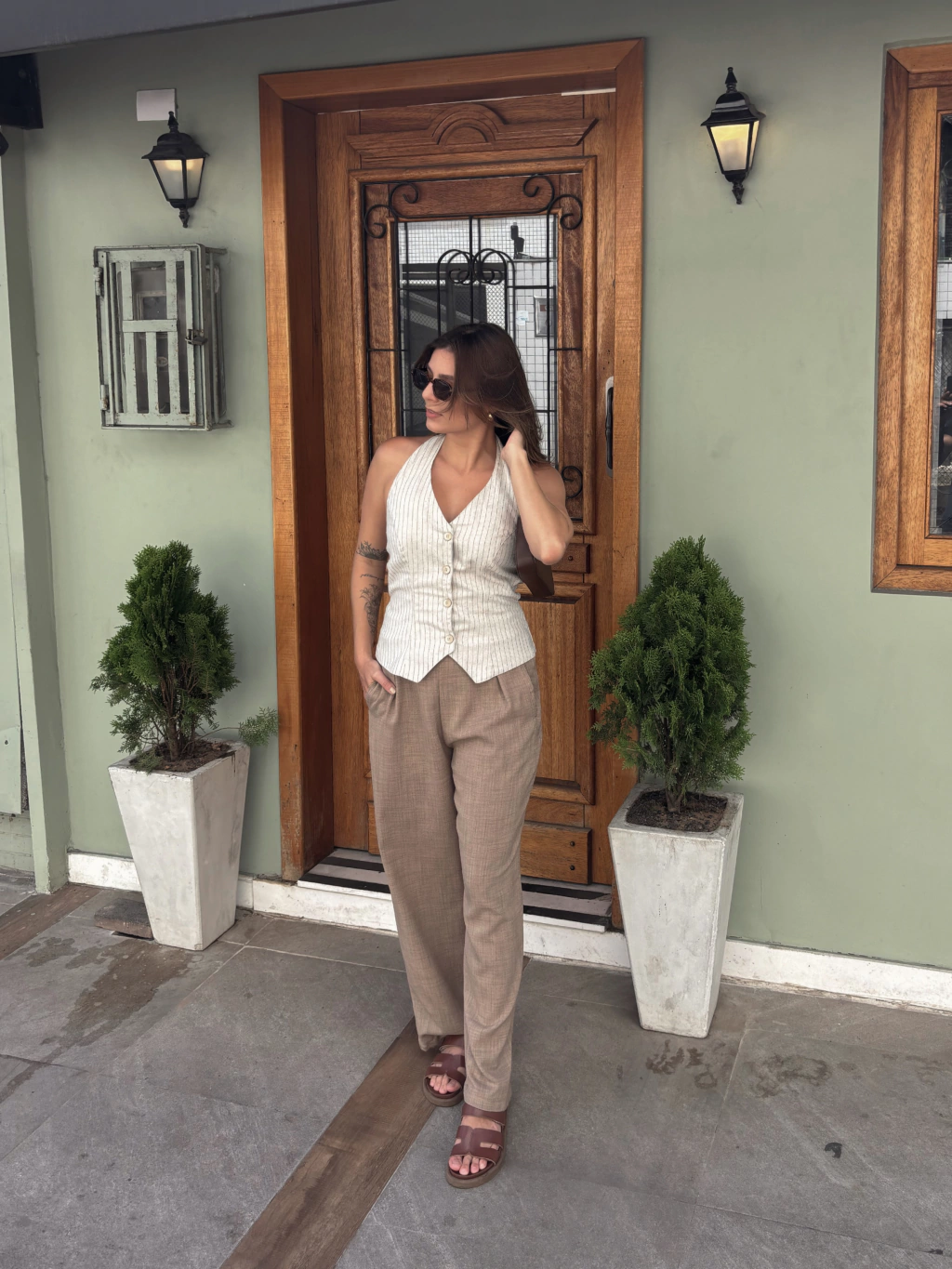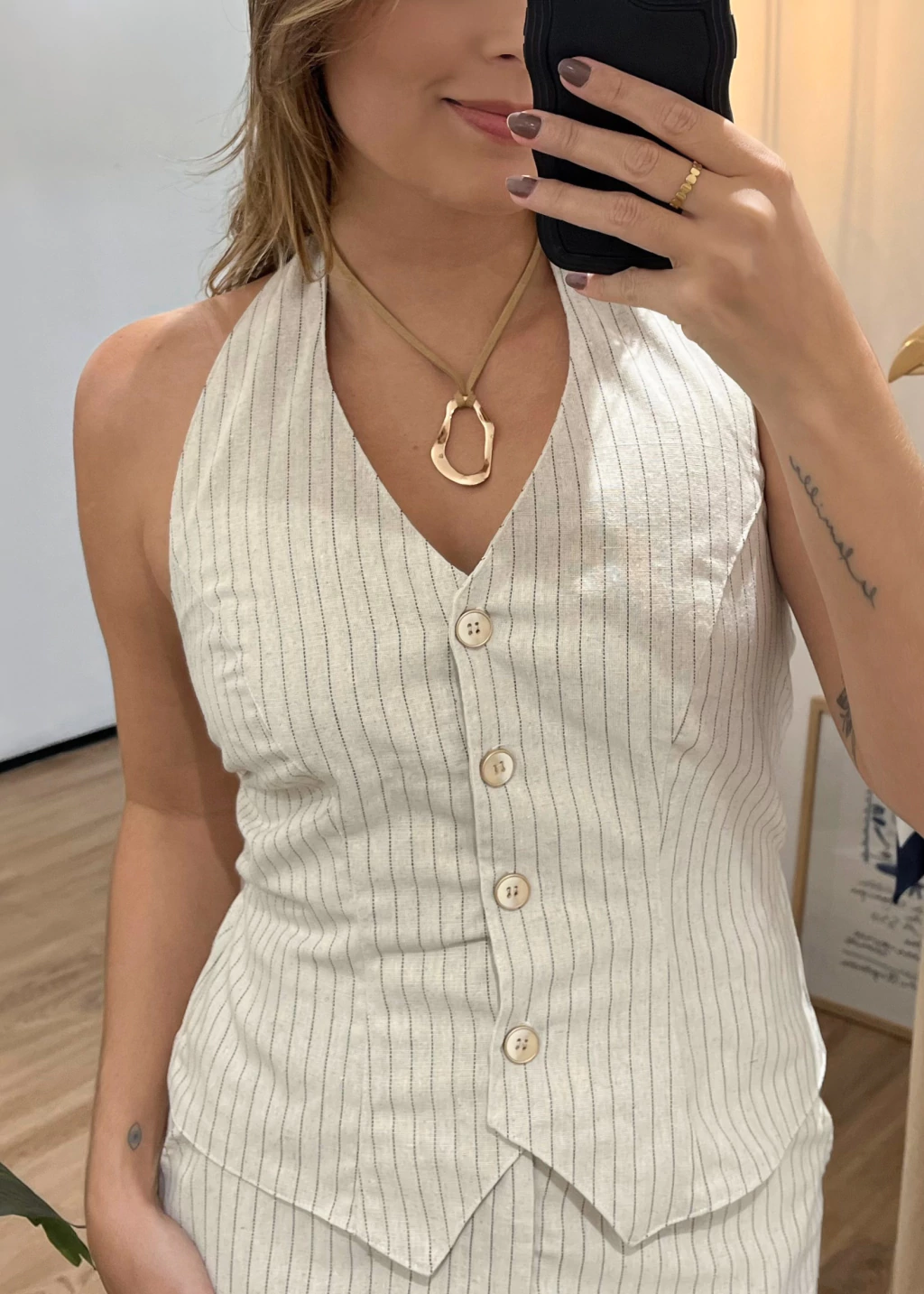 Descrição: Colete todo duplo, ajustado à silhueta com abotoamente frontal e no pescoço. Com rolotê para ajustar a cintura. Costas semi-nuas.