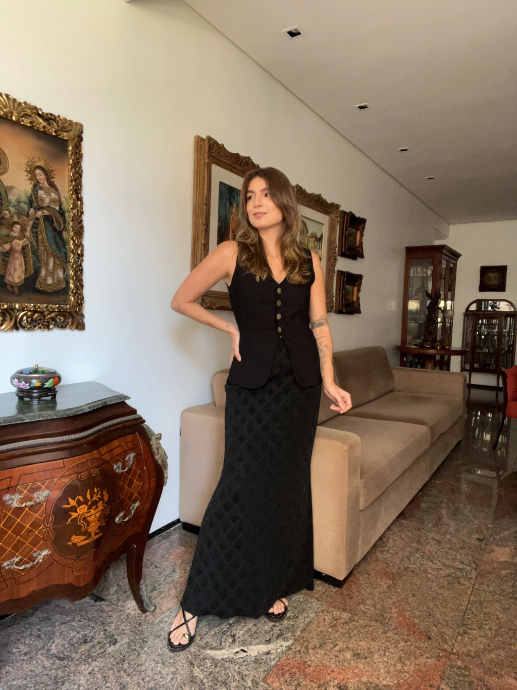 Descrição: Saia longa sereia em malha lurex com forro de malha leve, cós embutido e ziper invisível lateral.